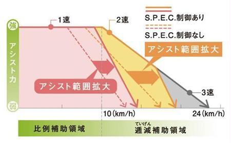 強度やブレーキ性能などに関して示された幼児2人同乗用自転車の基準には、発進時の安定性が確保されていることも含まれている。ハンドルがふらつきやすい発進時には、小さな踏み込み力でスムーズに走り出す性能が欠かせない。この条件として、通常の自転車では「ペダルを1回転させたときに進む距離が4.3メートル以下に抑えられる機能を有すること」、もしくは「電動アシスト自転車であること」とされている。