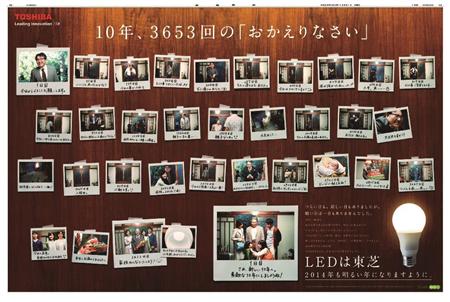 玄関で毎日、勤め人の父親の帰宅を待つ電球。雨の日も風の日も、上機嫌の時も落ち込んだときも、「おかえりなさい」と出迎える。娘との親子げんかや、初孫の誕生、そして定年退職…。LED電球と玄関の「10年」を描いた東芝の広告からは、平凡だが喜怒哀楽に満ちた家族のドラマが浮き上がってくる。