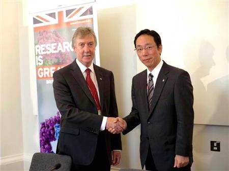 協力声明署名式で握手する東京電力福島第1廃炉推進カンパニーの増田尚宏最高責任者(右)と英セラフィールドのプライスCEO=1日午後、ロンドン大学(東電提供)【拡大】