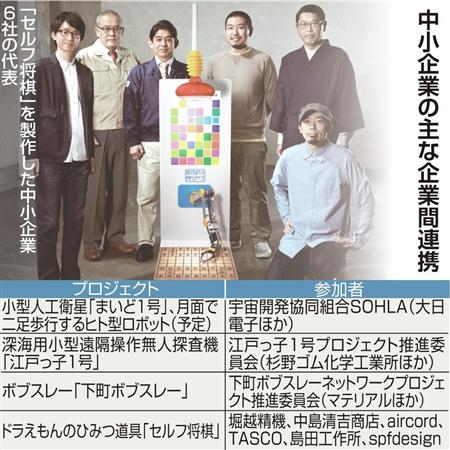 人工衛星、深海探査、ボブスレー…。中小企業が技術力を持ち寄り、大手にない発想で取り組む開発プロジェクトが新たな段階を迎えている。富士ゼロックスが中小6社に呼びかけ実現した「ドラえもん」の夢の道具を作る計画は、第2弾も検討中。人工衛星の開発で先駆けとなった大阪などの中小企業で構成する宇宙開発協同組合SOHLA(ソラ)は、新たにヒト型ロボットの開発に取り組む。本格的なビジネスに発展する事例が生まれるか。