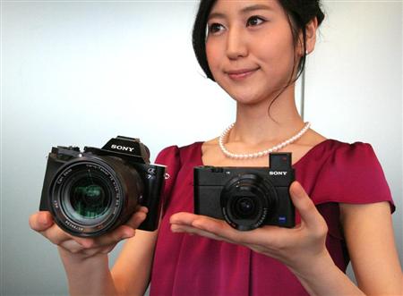 ソニーは16日、暗い場所でも高感度撮影を実現するミラーレス一眼カメラ「α7s」や高級コンパクトデジカメなど3機種を発表した。α7sは超高感度撮影を得意とするほか、フルハイビジョンの約4倍の解像度を持つ「4K」動画撮影なども可能。市場想定価格は23万円前後(税抜き)で6月20日に発売する。今年度の全体出荷計画は前年度実績比約3割減を見込むが、これらの高級機種で収益力を高める。