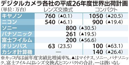 主要デジタルカメラメーカー各社の平成26年度の世界出荷計画は、軒並み前年度実績を下回る。スマートフォン(高機能携帯電話)に押され、廉価モデルの生産抑制などが進むコンパクトデジタルカメラは大幅な減少を見込む。