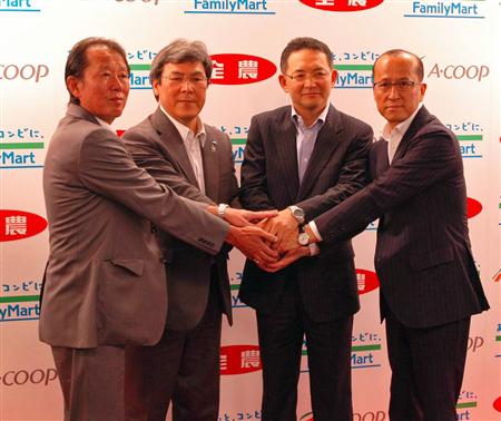 コンビニエンスストア大手のファミリーマートは28日、全国農業協同組合連合会(JA全農)と提携し、JA全農の食品スーパーであるAコープとファミマの一体型店舗を展開することで合意したと発表した。愛媛県伊予市で一体型店舗1号店を31日にオープンする。さらに両社で加工食品の共同開発も手がける方針だ。