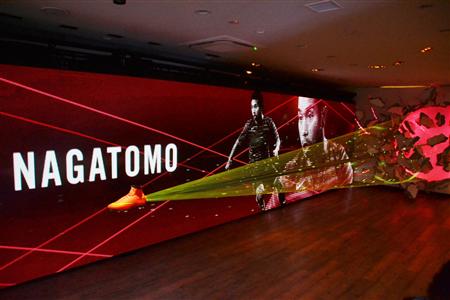 会場1階には、長友佑都やポルトガル代表のクリスティアーノ・ロナウドが着用する3本の糸で編み上げたスパイク「マーキュリアル スーパーフライ」を展示。スパイクのかかとから飛び出た無数の糸には映像が映り込む仕掛けで、壁一面の巨大モニターには契約選手のイメージ映像などが流れる。