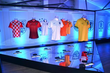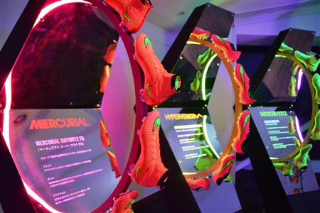 12日開幕のサッカーワールドカップ(W杯)ブラジル大会に出場する同社と契約している10カ国のユニホームや、出場選手が着用する最新のスパイクを展示。会場で借りられる携帯端末では契約選手や商品に関するクイズやゲームを楽しめるほか、展示物の技術を体感できる仕掛けを動かせる。