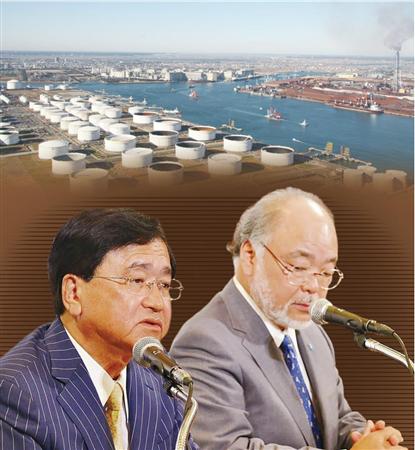 買収に合意し会見する三菱ケミカルHDの小林喜光社長(左)と大陽日酸の田辺信司社長。小林社長は石油化学からの脱却を急ぐ(コラージュ)【拡大】