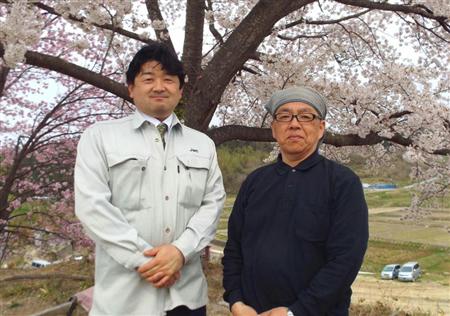独自の農地除染の実証に挑む齊藤登氏(右)とJMCの佐藤雅人氏。桜の季節と入れ替わりに稲作と除染の準備が始まった=4月19日、福島県二本松市の齊藤氏の農園【拡大】