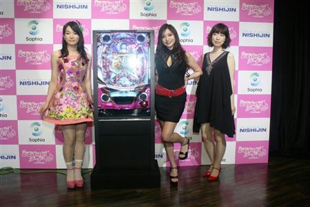 発表会当日は、ゲストに声優陣を代表して、皇天女役の浅野真澄さんと、艶鬼役のたかはし智秋さんが来場。セクシーな声と抜群のプロポーションを持つたかはしさんは、自ら西陣宣伝部長を買って出て新機種をPR。さらに、オープニングテーマ曲を歌う歌手で声優でもある千菅春香さんが「桃色ファンタジー」を披露し、会場を沸かせた。