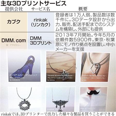 3D(3次元)プリンターを活用した“個人メーカー”が続々誕生している。これに伴いインターネット経由で受け取った3Dデータを基に製品を出力し、サイト上で販売するサービスが相次ぎ出現。利用者が1万人近くに達するサービスも出てきた。今はアクセサリーや雑貨が中心だが、数年内には多様な素材の精巧な製品を数百万個単位で量産可能となり、家電の“印刷”なども視野に入る。拳銃が造れるなど課題を抱えながらも「モノ作り革命」の潮流は加速度を増してきた。