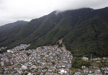 広島市安佐南区の土砂崩れ現場=20日午前10時15分、広島市安佐南区(本社ヘリから)【拡大】