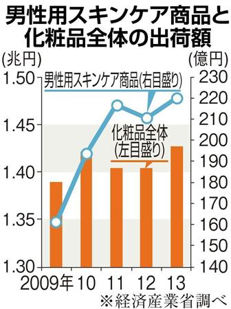 男性用のスキンケア商品の需要拡大に向け、皮膚や肌のケアへの関心を高めてユーザーを取り込もうとする取り組みを化粧品各社が強化している。化粧品市場全体が頭打ち状態の中で、伸び続ける男性向け商品で収益を底上げしようという考えだ。