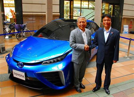 福岡・天神に展示されたFCVの前で握手する小川洋・福岡県知事(右)と九州経済連合会の麻生泰会長(福岡県提供)【拡大】