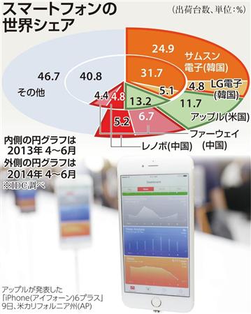 米電子機器大手アップルは9日(日本時間10日未明)、大画面を持つスマートフォン(高機能携帯電話)の新製品「iPhone(アイフォーン)6」と「6プラス」、腕時計型端末「アップルウオッチ」を発表した。19日から販売する。大画面スマホや4年ぶりの本格的な新製品となる腕時計型端末を投入した背景には、低価格を武器に世界のスマホ市場で急成長する中国メーカーへの危機感がある。中国勢はアップルだけでなく、日韓メーカーのシェアも奪い、市場に地殻変動を起こしつつある。