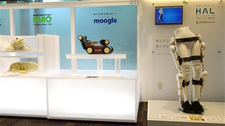 大和ハウス工業本社で展示されるサイバーダインの歩行支援ロボット「HAL(ハル)」(右)、床下点検ロボット「モーグル」(中央)、アザラシ型ロボット「パロ」(左)=8月19日午前11時50分ごろ、大阪市北区(西川博明撮影)【拡大】