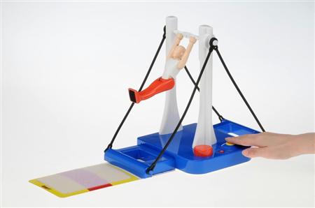 2つのボタンを押して鉄棒競技の回転(大車輪)から着地の成功までを目指して遊ぶ。黄色いボタンを押して人形を回転させ、回転中にタイミングよく赤いボタンを押すと、人形が鉄棒から離れ、回転しながらマットに着地する。鉄棒競技と同じように、美しく着地を決めることができれば成功。着地は、回転の速さとタイミングによって成功・失敗が決まるという。