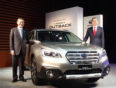 新型アウトバックは立体的なデザインで、大きめのフロントグリルを採用した。2・5リットルエンジンを搭載し、燃費は1リットル当たり14・6キロ。運転支援システム「アイサイト」の最新版を搭載している。