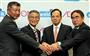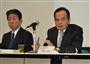 首都圏スーパー連合の共同持株会社設立発表会で、撮影に応じるイオンの岡田元也社長、カスミの小浜裕正会長、マルエツの上田真社長、丸紅の秋吉満副社長(左から)=31日、東京都千代田区(平尾孝撮影)【拡大】