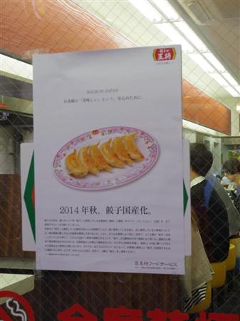 ギョーザのあんに使っている豚肉やキャベツ、ニラ、ニンニクはすでに国産になっており、店頭には「餃子国産化」「麺も国産化」などと書かれたポスターを掲示し、食材へのこだわりをアピールしている。