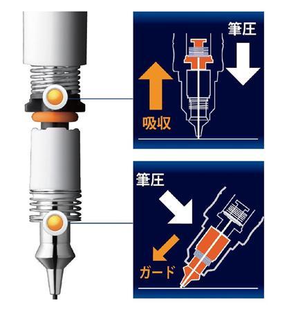 この製品は、芯が折れないように、2つの工夫がなされた。ひとつは、芯に垂直方向の力がかかると、内蔵スプリングが作動して芯が内側に戻る仕組みとなっている。