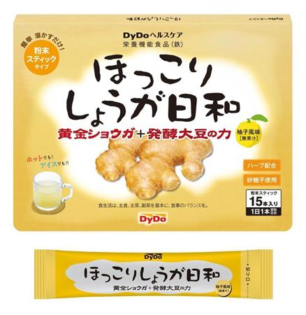高知産の「黄金ショウガ」を使用した粉末飲料。鉄の吸収を助ける作用があるという大豆発酵多糖類を配合。2グラム×15本入り1944円。通信販売を中心に販売中。