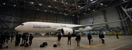A350は胴体の長さに応じて3タイプあり、標準的な座席数は276~369席。機体の53%に複合材を使うなどして軽量化し、エアバスによると燃費効率は競合機より25%優れ、ライバル機のボーイング787を上回るという。