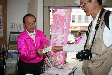 貝塚駅や水間観音駅では、地元で開催されるウオークイベントに合わせ、特設ブースを設置。水間鉄道の職員に市職員も加わり、大々的な販売促進キャンペーンを展開した。