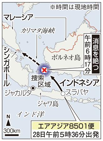 【シンガポール=吉村英輝】エアアジア8501便の機長は消息を絶つ直前、進路変更要求を管制に出していた。付近はこの時期、多数の積乱雲が発達しやすく「パイロット泣かせの航路」とも呼ばれる。状況からは、計器が着氷し操縦に失敗した、2009年のエールフランス機墜落事故との類似性も指摘される。