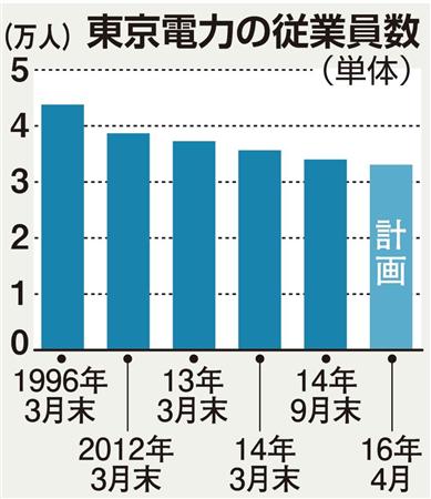 従業員数は、ピークだった1995年よりも1万人余り少ない体制となる。今後も定年退職などで従業員は減るものの「(原発事故の)賠償や廃炉作業などで人手が必要になる」(東電首脳)ことから、一定の人員規模を維持。22年度末で3万2600人程度の体制となる見込みだ。