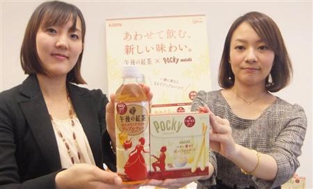 両社の20~30代の女性社員がプロジェクトチームを組み、約1年間かけ、開発した。ポッキーは参考店頭価格が195円、午後の紅茶は希望小売価格152円。