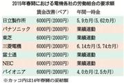 電機メーカーの各労働組合が19日、2015年春闘の要求書を経営側に提出し、主要労組の要求が出そろった。各社とも、ベースアップ(ベア)に相当する賃金改善分で6000円を求める。ベア要求は昨年に続き2年連続となる。ただ、15年3月期の連結最終損益が赤字に転落する見通しのシャープの労組は、同日の要求書提出を見送り、加盟する電機連合の「統一闘争」からは事実上離脱するなど、同一業界内で温度差が広がっている。