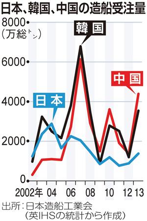 日本の造船業が息を吹き返してきた。1月末、国内造船大手の今治造船が16年ぶりに超大型ドックの新設を発表。1月の船舶受注量では、日本が韓国と中国を抜き1位に返り咲いた。日本が月間ベースの受注量で1位になったのは2008年3月以来6年10カ月ぶりだ。円安や造船各社の構造改革によって競争力が高まった。かつて日本を追い抜き“造船大国”にのし上がった中韓勢は高い技術を誇る日本メーカーの復活に戦々恐々としている。