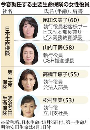 大手生命保険会社が相次いで女性を役員に登用している。日本生命保険は4日、尾田久美子お客様サービス副本部長(60)と、山内千鶴サービス企画部担当部長(58)を25日付で執行役員に昇格させると発表した。尾田氏については、保険営業の新システムへの移行と定着、山内氏は、男性職員の育児休業の完全取得を実現させた実績を評価した。