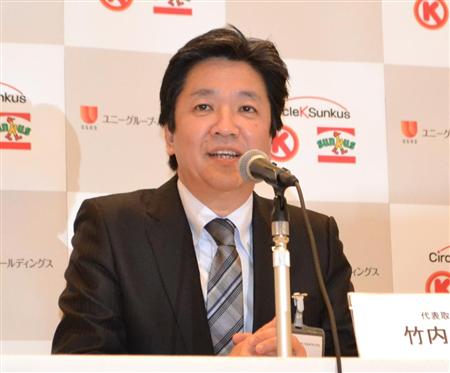 ファミリマートとの経営統合に向け交渉入りしたユニーグループ・ホールディングス傘下のコンビニエンスストア大手、サークルKサンクスの竹内修一社長が18日、横浜市内で会見し、統合後はコンビニ首位のセブン-イレブン・ジャパンを売り上げ規模でも追い抜き、商品力強化のため、食品の専用工場建設などを検討する考えを示した。