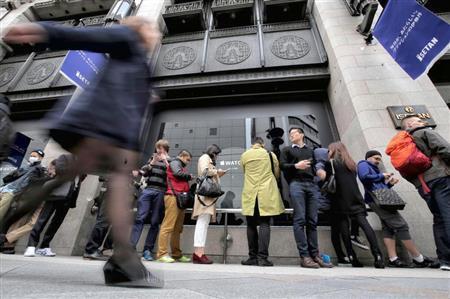 米アップルの腕時計型端末「アップルウオッチ」の予約受け付けが10日始まり、アップルの直営店や伊勢丹新宿本店(東京・新宿)、ソフトバンクモバイルの2店舗(銀座、表参道)では一足早く、端末を試着しようと開店前から熱心なファンが並んだ。24日に発売する。