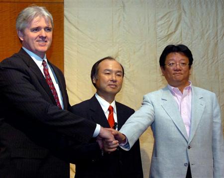 2006年3月、ボーダフォン買収会見で、握手するビル・モロー・ボーダフォン日本法人社長(左)、孫正義・ソフトバンク社長(中)ら【拡大】