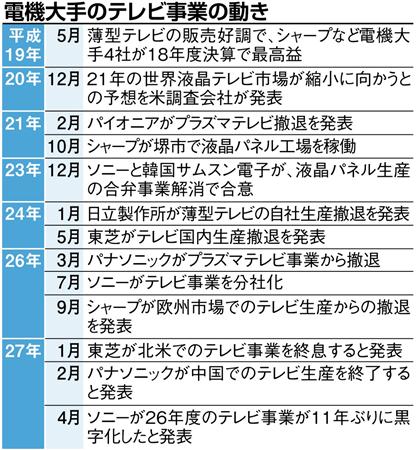 昨年7月に分社化されたソニーのテレビ事業は、15年3月期に83億円の黒字(前期は257億円の赤字)を計上し、04年3月期以来の黒字に転換。固定費の削減などが要因だ。15年1~3月期は赤字で、ソニー幹部は「さらに事業の安定性を高めなければならない」と話す。