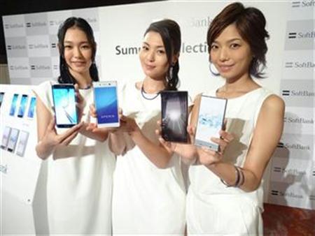 ソフトバンクが発表したスマートフォンの夏モデル4機種=19日、東京都港区【拡大】