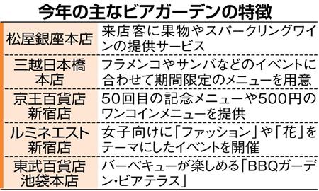本格的な夏の到来を前に「夏商戦」が花盛りだ。百貨店各社は女性向けにイベント盛りだくさんの屋上ビアガーデンを今月以降、相次いでオープン。水着各社は、景気回復期に人気という、パステルカラーの商品を充実させ、ひと夏の商戦を盛り上げようと躍起だ。