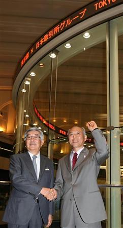 東京都発行の外債の上場セレモニーで斉藤惇・日本取引所グループCEO(左)と握手する舛添要一・東京都知事=20日午後、東京証券取引所【拡大】