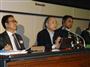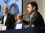 ソフトバンクの決算発表記者会見に出席した孫正義社長(左)とニケシュ・アローラ氏=11日午後、東京都内のホテル【拡大】