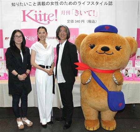 雑誌「Kiite!」発売記念イベントのフォトセッションでポーズをとる、左から、郡司美香編集長、モデルの浜島直子さん、日本郵便の切手デザイナーの玉木明さん、日本郵便のキャラクターのぽすくま=22日、東京都千代田区(荻窪佳撮影)【拡大】