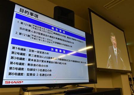 経営再建中のシャープは、大阪市内で株主総会を開いた。議長を務めた高橋興三社長は冒頭、平成27年3月期連結決算で2千億円以上の最終赤字に転落したことについて「株主のご期待に応えられず、深くおわびする」と述べた。株主からは経営陣の責任を問う声が相次いだが、主力取引銀行などからの計2250億円の資本支援や、1219億円の資本金を5億円に減らす減資、取締役の選任など全6議案は承認された。