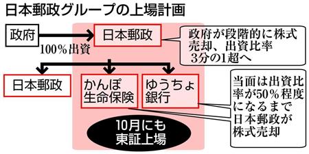 株式市場への影響を考えて、当初市場に売り出される日本郵政の政府保有株式は全体の10~15%程度とみられる。また、日本郵政が100%保有するゆうちょ銀とかんぽ生命は半数近くまで順次放出する見通しだ。