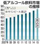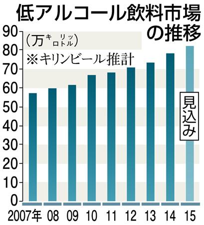 キリンも、果汁と酒だけでつくる本搾りの1~5月期の販売数量が4割増加と好調で、6~7月の生産数を2割増の132万ケースに増やす。低アルコール飲料は、ビール離れの進む若者の受け皿として人気。市場は2014年まで7年連続で伸長が続き、ビール各社も開発に力を入れている。