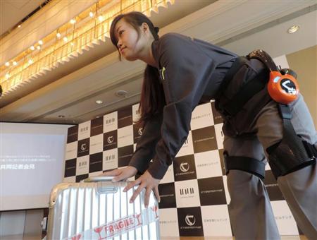 羽田空港の荷物運搬などで活用が期待されるサイバーダインのロボットスーツ「HAL」作業支援用=2日、東京都大田区【拡大】