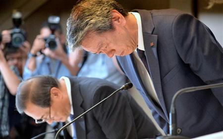 利益水増し問題についての会見で頭を下げる室町正志会長、田中久雄社長(左から)=21日、東京都港区の東芝本社【拡大】