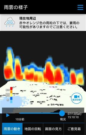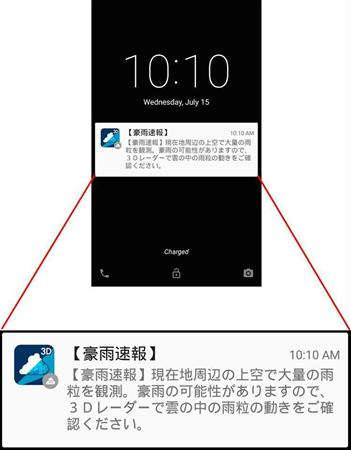 3D雨雲ウォッチでは、ユーザーの現在地またはユーザーが登録したMY地点(8月中旬対応予定)の10キロメートル四方の範囲において、上空にたまる雨量がしきい値を超えた場合、2、3分以内にプッシュ通知によって「この後、バケツをひっくり返したような豪雨の可能性がありますので、ご注意ください」などと知らせる。