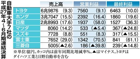 世界販売の7割弱を北米が占める富士重工業は売上高、利益のいずれも同期として過去最高を更新した。SUV「アウトバック」などが販売を伸ばしたほか、円安など為替変動の利益押し上げ効果が営業増益分の9割に相当する500億円に上った。ホンダも販売不振で国内の営業利益は半減したが、北米でSUV販売が好調で2桁の増益率を確保した。スズキは注力するインド市場での好調が業績を牽引(けんいん)した。