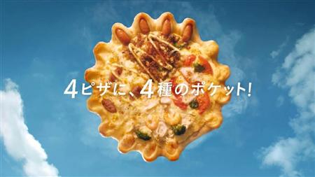 「あれは何?」、「店長4(フォー)ピザです」、「ただの4ピザじゃないわ」-。CMの冒頭、上空の異変を察知し、店の外に出てきた2人が目にしたのは1枚で4つの味が楽しめる「巨大な4ピザ」だ。