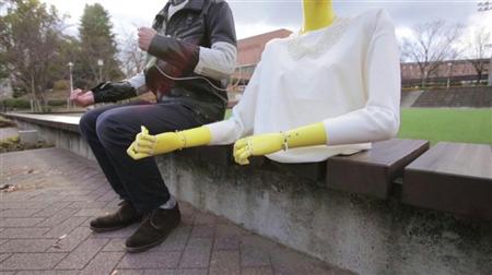 革ジャンを着て腕を曲げてみる。すると、そばにあるマネキンがまったく同じ動きをした。次はねじるように腕を動かすと、やはり同じ動作を繰り返した。着ている革ジャンの肘の部分に貼り付けた布地の作用だ。